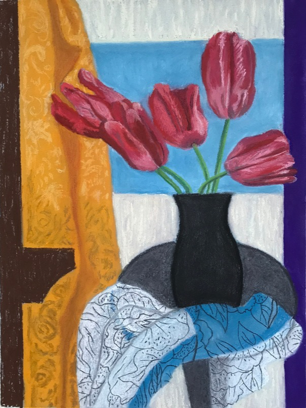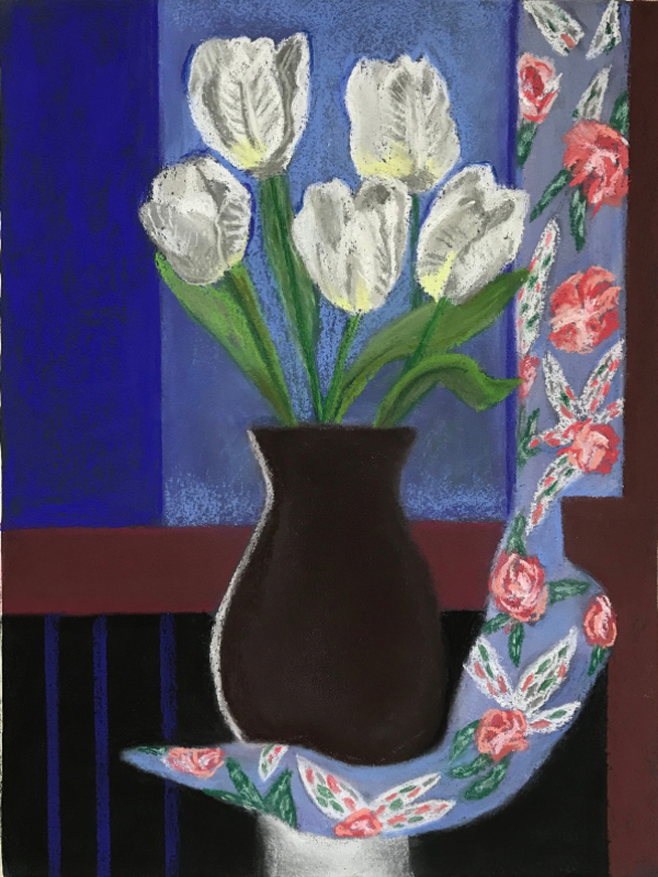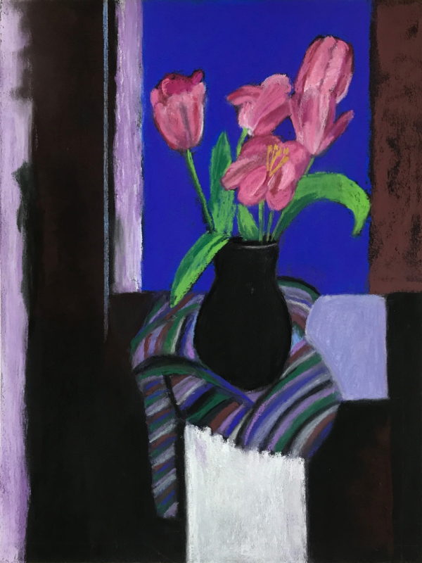 This pastel series, Tulips by a Window, was inspired by the paintings of Henri Matisse. I am drawn to his use of intense colour, his simplification of forms, and his pure love of Life! His life work includes many still life paintings which always pull me into his world through the light he uses to create a “still life” that becomes a dynamic visual melody.